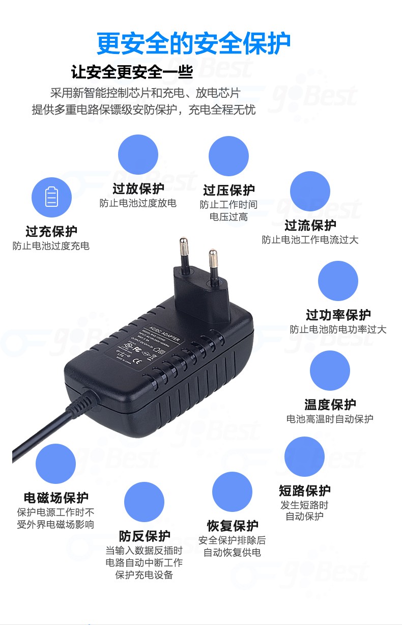 • 采用前沿IC控制方案和先進的制造工藝,高精度,低噪音;過壓,過流,過充,短路等多重保護。